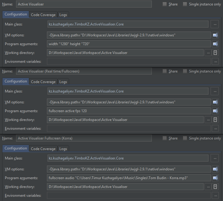 Additionally, you can configure the visualiser by specifying program arguments. Table of all possible program arguments can be found below, but keep in mind none of them are required for the app to run.