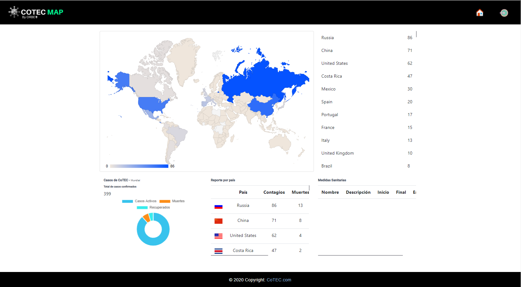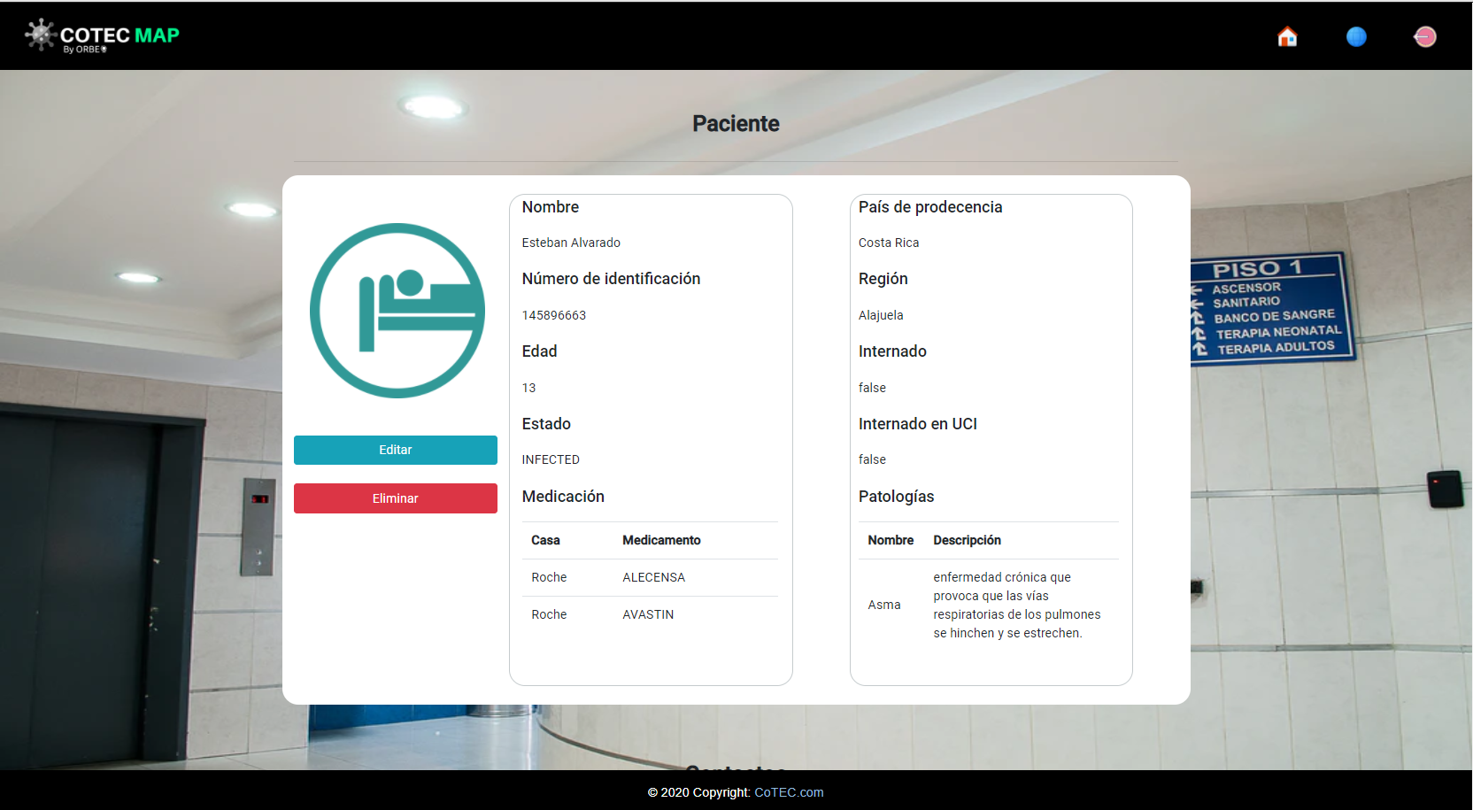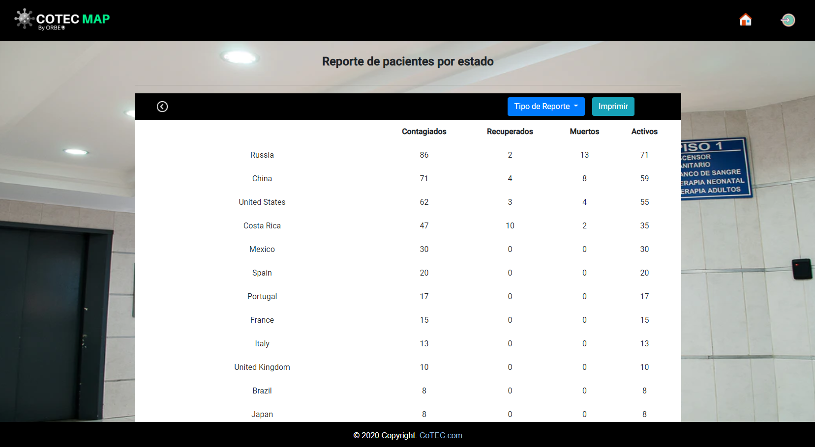 CoTEC Map is a suite of virus case monitoring and hospital management applications. The web application provides a view for monitoring cases worldwide, presenting a specific breakdown of each country, it also provides the hospital administration system that allows managing patients and their recent contacts.