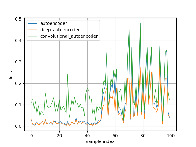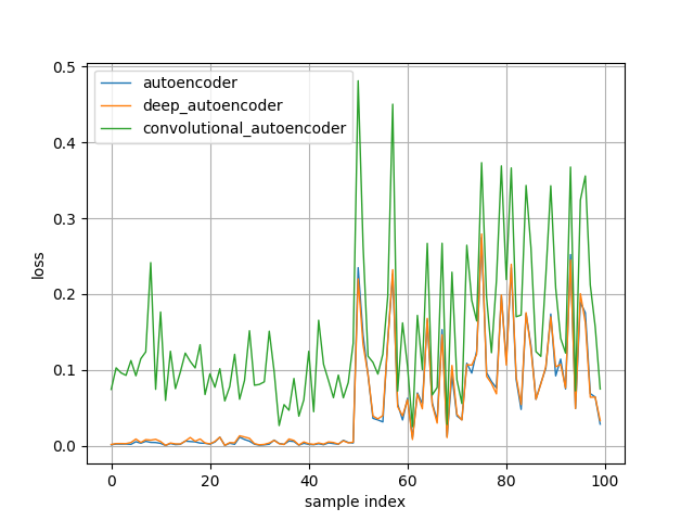 Sample index (x-axis) 0~49 correspond to losses computed on 50 normal validation samples, and 50~99 correspond to losses computed on 50 abnormal samples. You can see losses during sample index 50~99 increase as expected. However, contraty to my expectations, autoencoder and deep_autoencoder are more accurate than convolutional_autoencoder in this settings. Since generalization performance of convolutional layers are generally higher than fully-connected layers, it seems that convolutional_autoencoder could reconstruct accurately even abnormal samples. It should be noted that good models and tricks in classification problems may not necessarily perform well in problems of anomaly detection using Autoencoder.