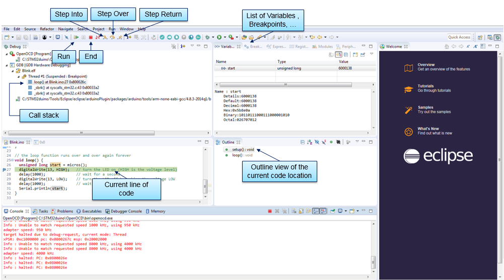 Now, you can easily debug your code by using the Eclipse debug features including running step-by-step mode, live breakpoint, inspecting memory access, live view of variable contents and many more.